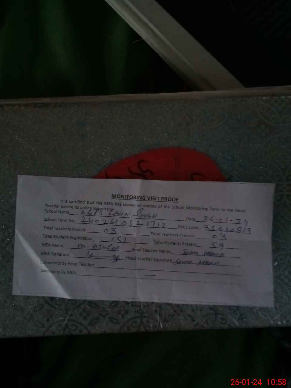 | Certified that this School was Inspected by the Undersigned MEA/DMO Today and the Information Stated Above is as Per Record. | |||||