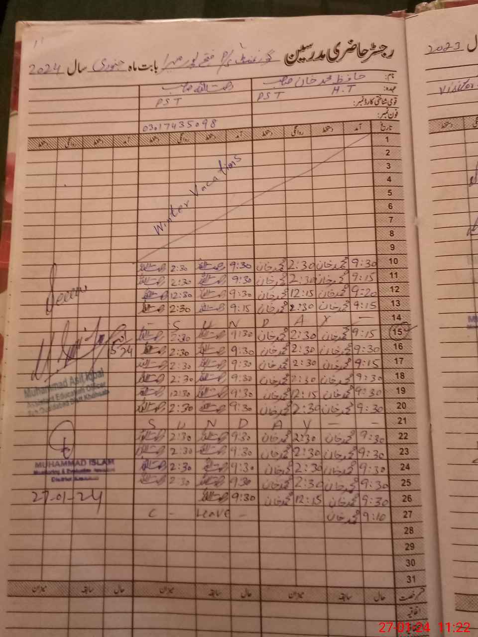 | Name: MU**** KH**** Designation: (School Headmaster's/Headmistress's) PST Phone/Cell Number: 03**** |