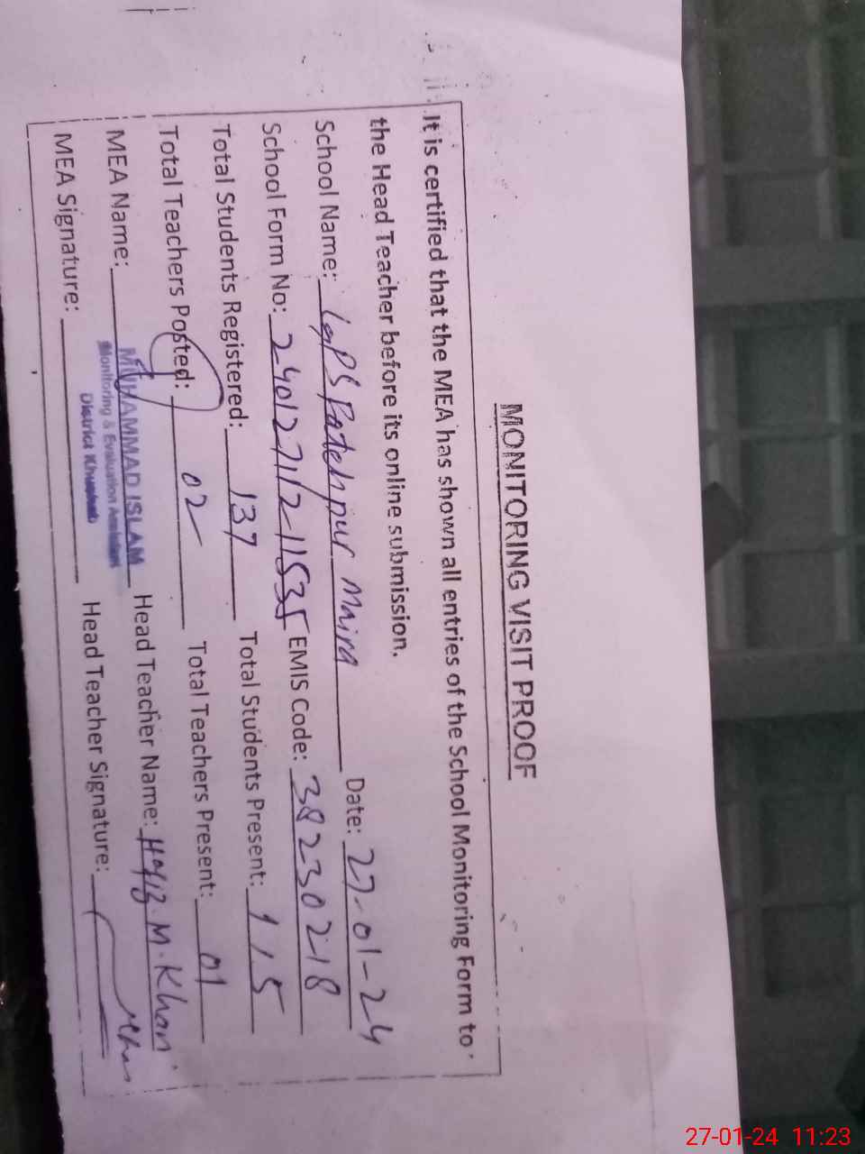 | Attendance Register | Head Teacher | MEA with School | Visit Proof |
