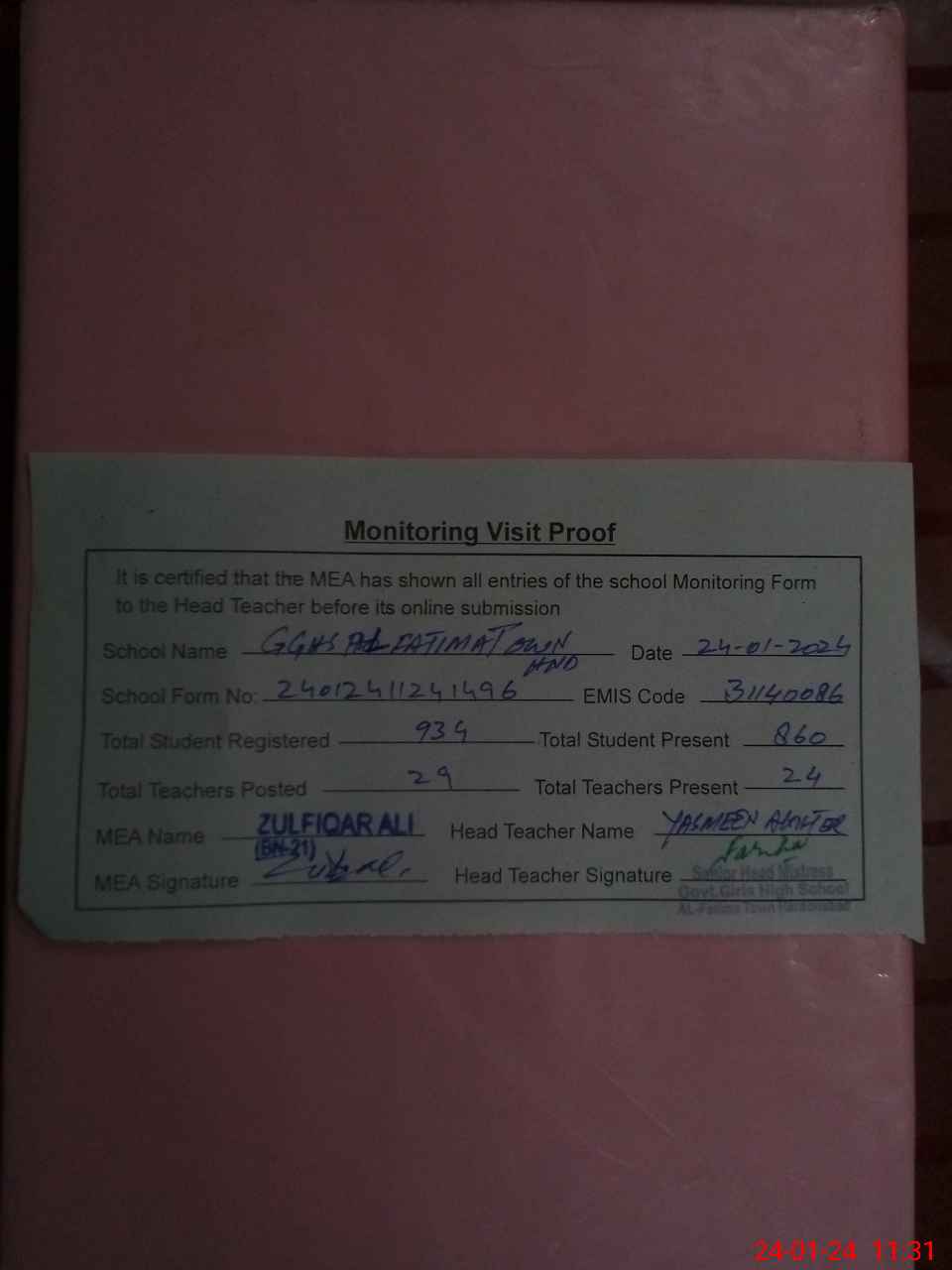 | Attendance Register | Head Teacher | MEA with School | Visit Proof |