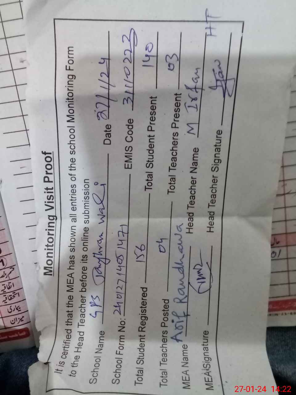 | Attendance Register | Head Teacher | MEA with School | Visit Proof |