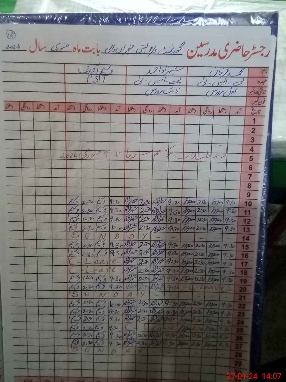 | CNIC | Full Name | Designation | R/C | Absence During Last Calender Month |