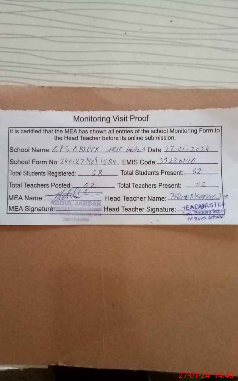 | EMIS Code: 39220170 | Name of School: GPS O BLOCK ARIFWALA | |||