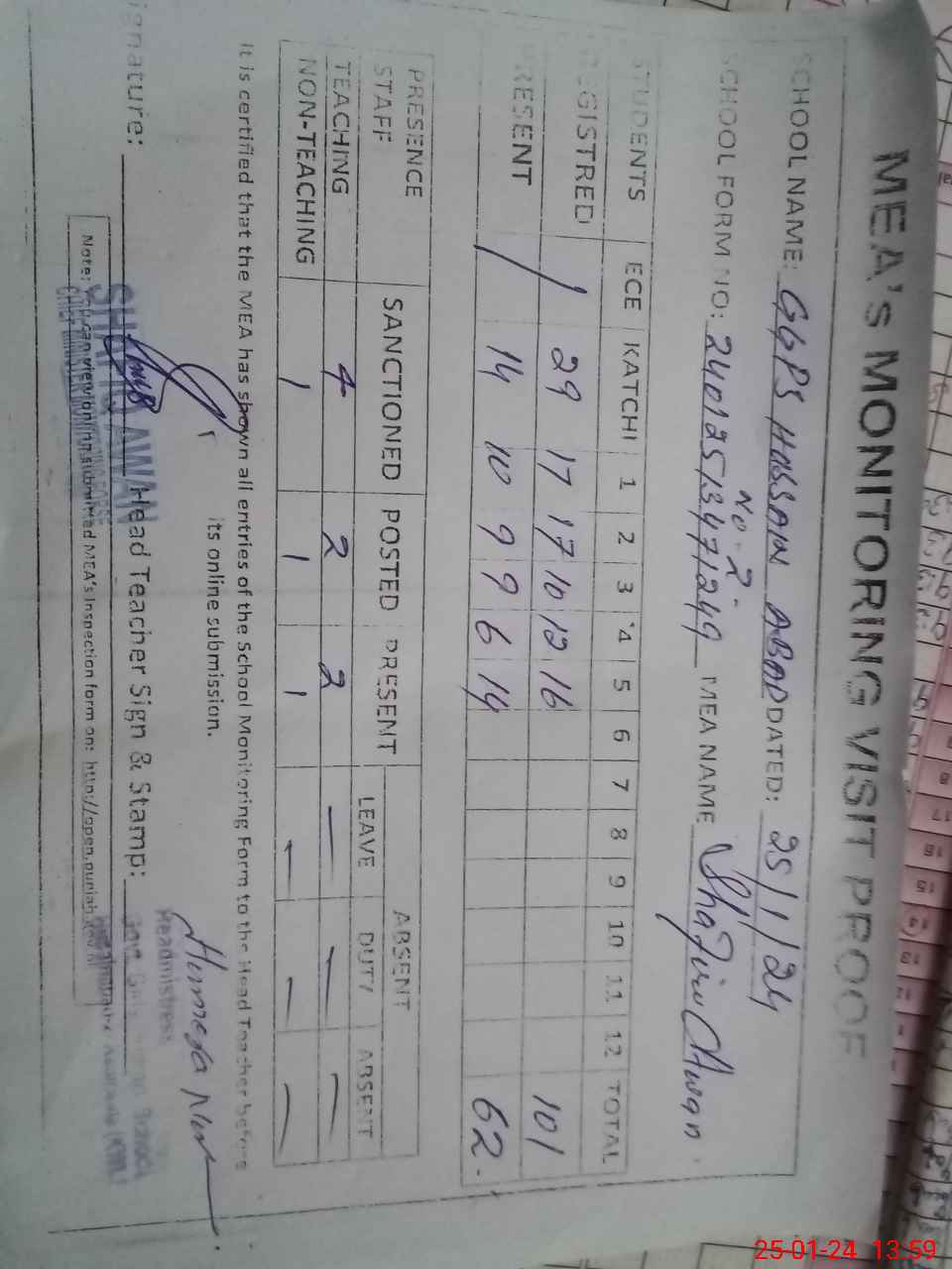 | Attendance Register | Head Teacher | MEA with School | Visit Proof |