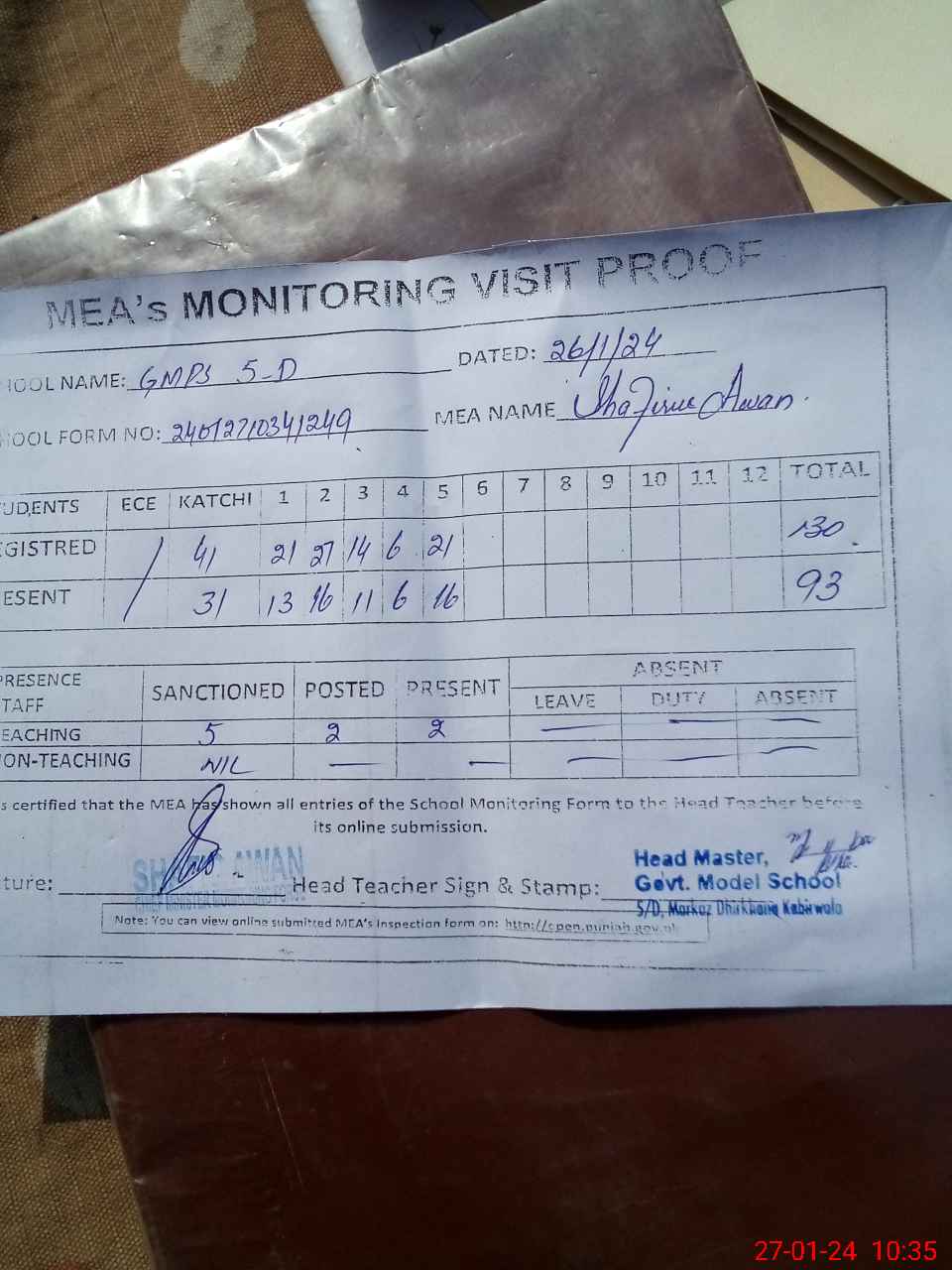 | Attendance Register | Head Teacher | MEA with School | Visit Proof |