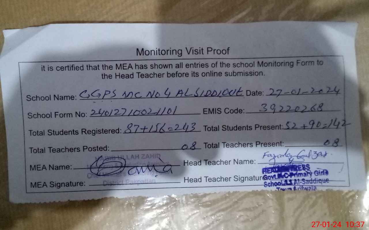 | Attendance Register | Head Teacher | MEA with School | Visit Proof |