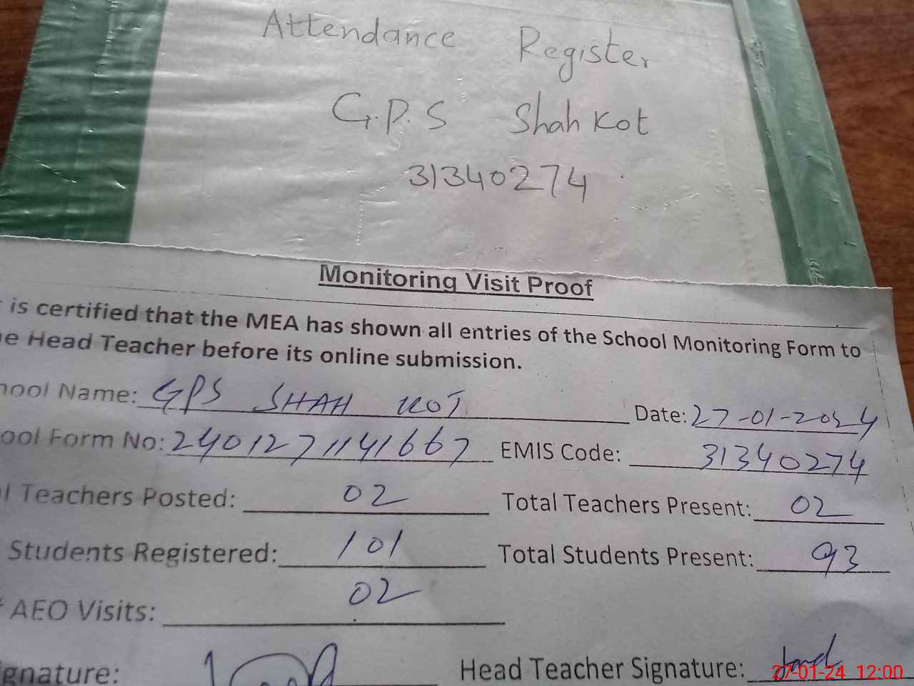 | Attendance Register | Head Teacher | MEA with School | Visit Proof |