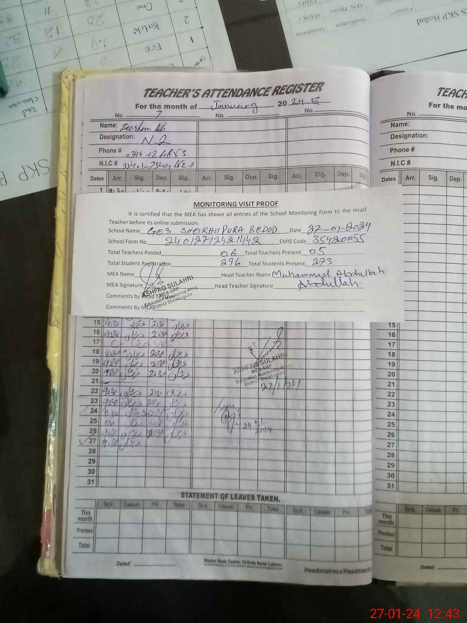 | Attendance Register | Head Teacher | MEA with School | Visit Proof |