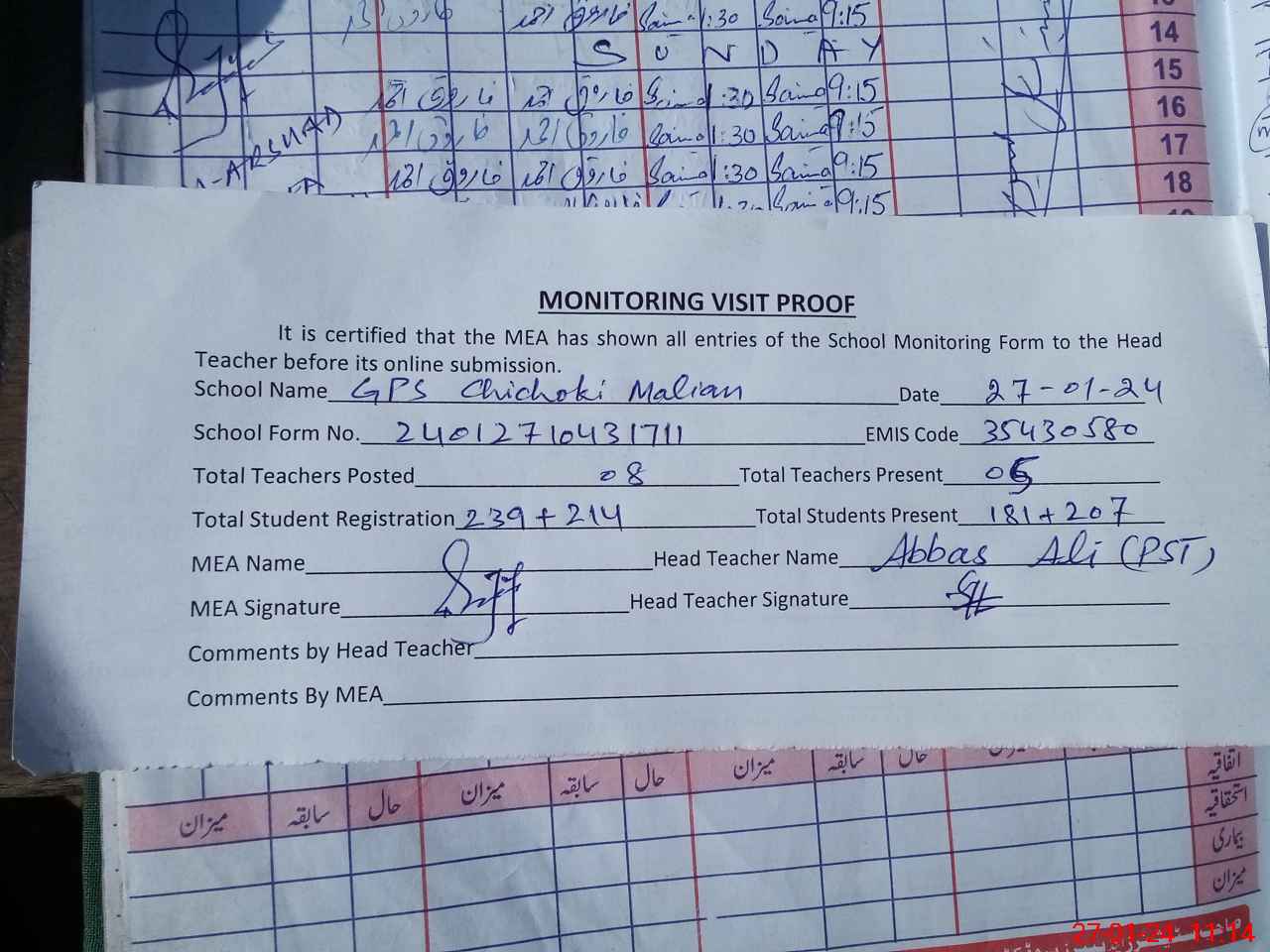 | Attendance Register | Head Teacher | MEA with School | Visit Proof |