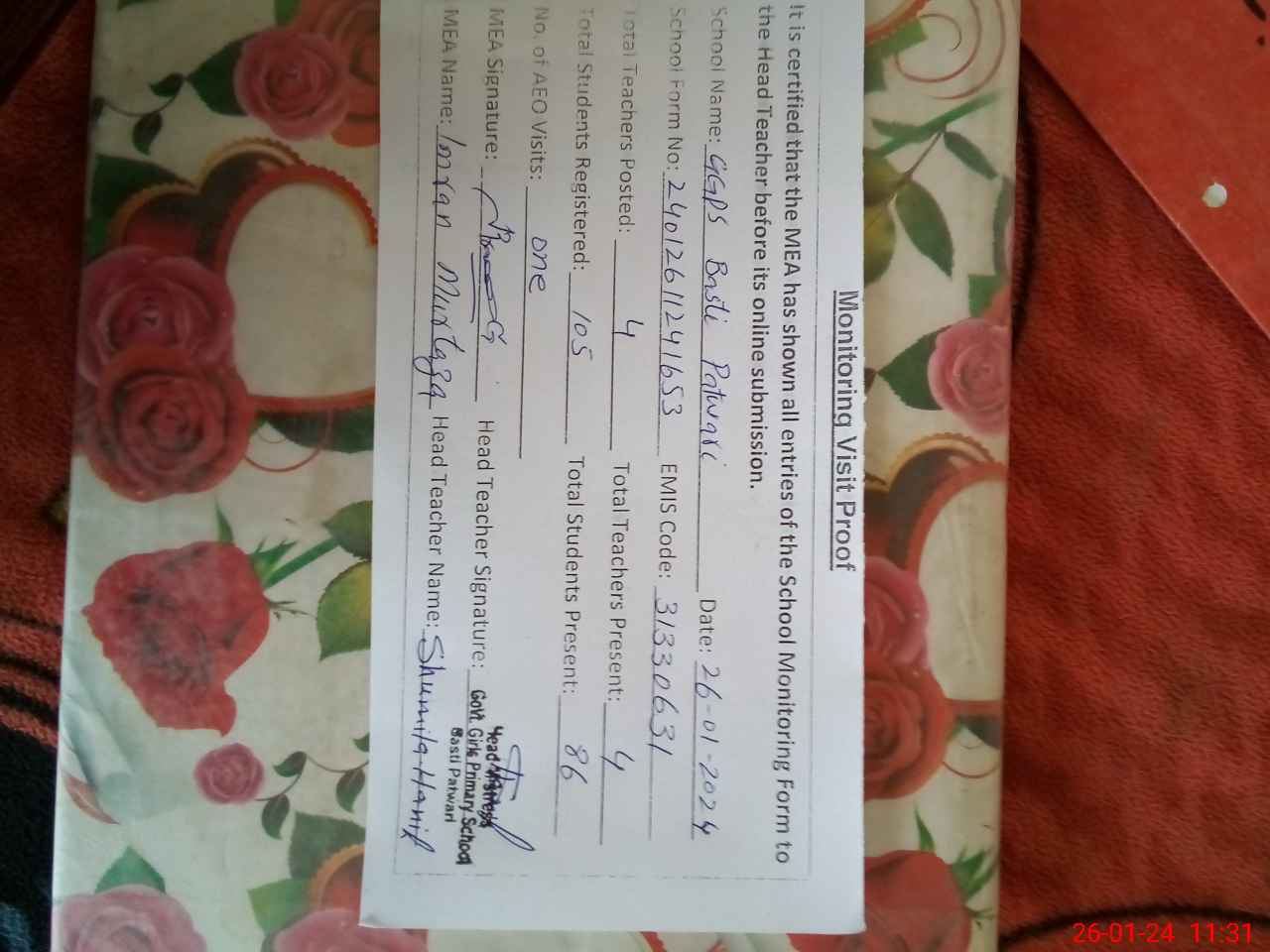 | Attendance Register | Head Teacher | MEA with School | Visit Proof |