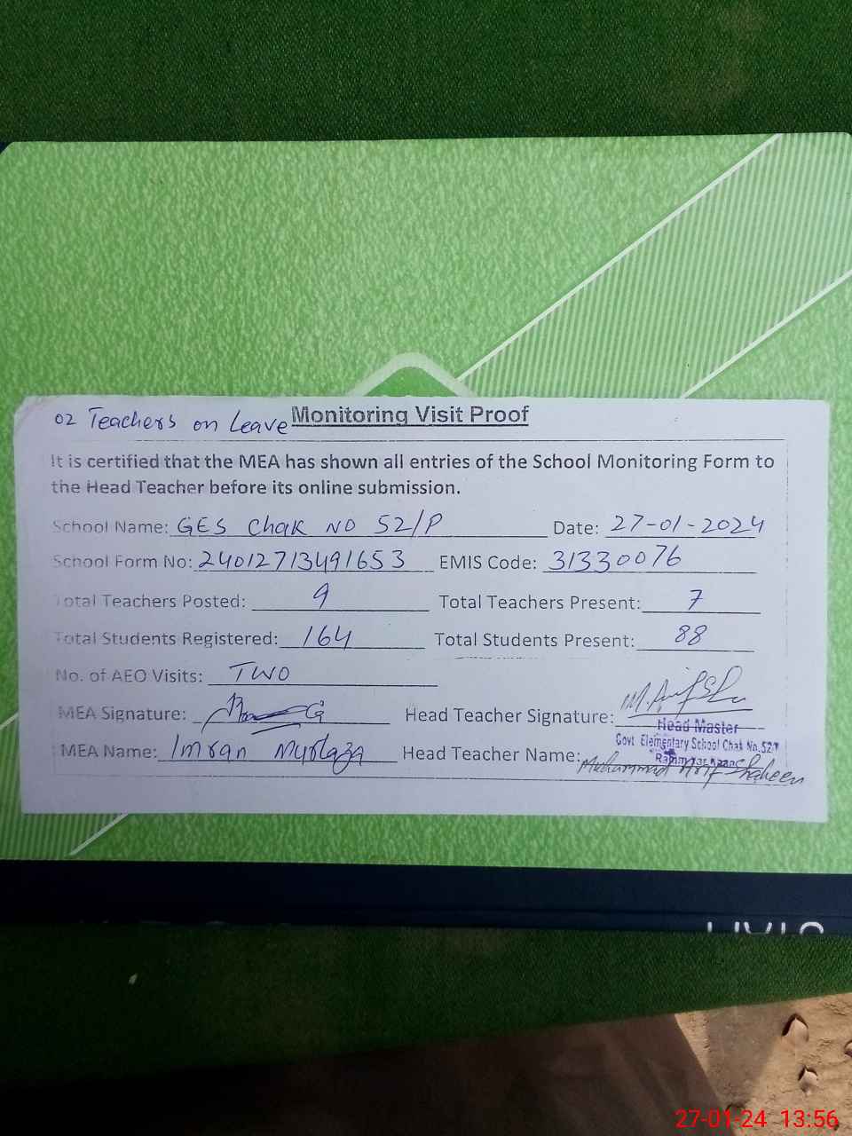 | Attendance Register | Head Teacher | MEA with School | Visit Proof |