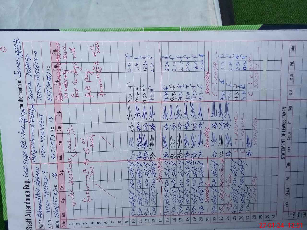 | CNIC | Full Name | Designation | R/C | Absence During Last Calender Month |