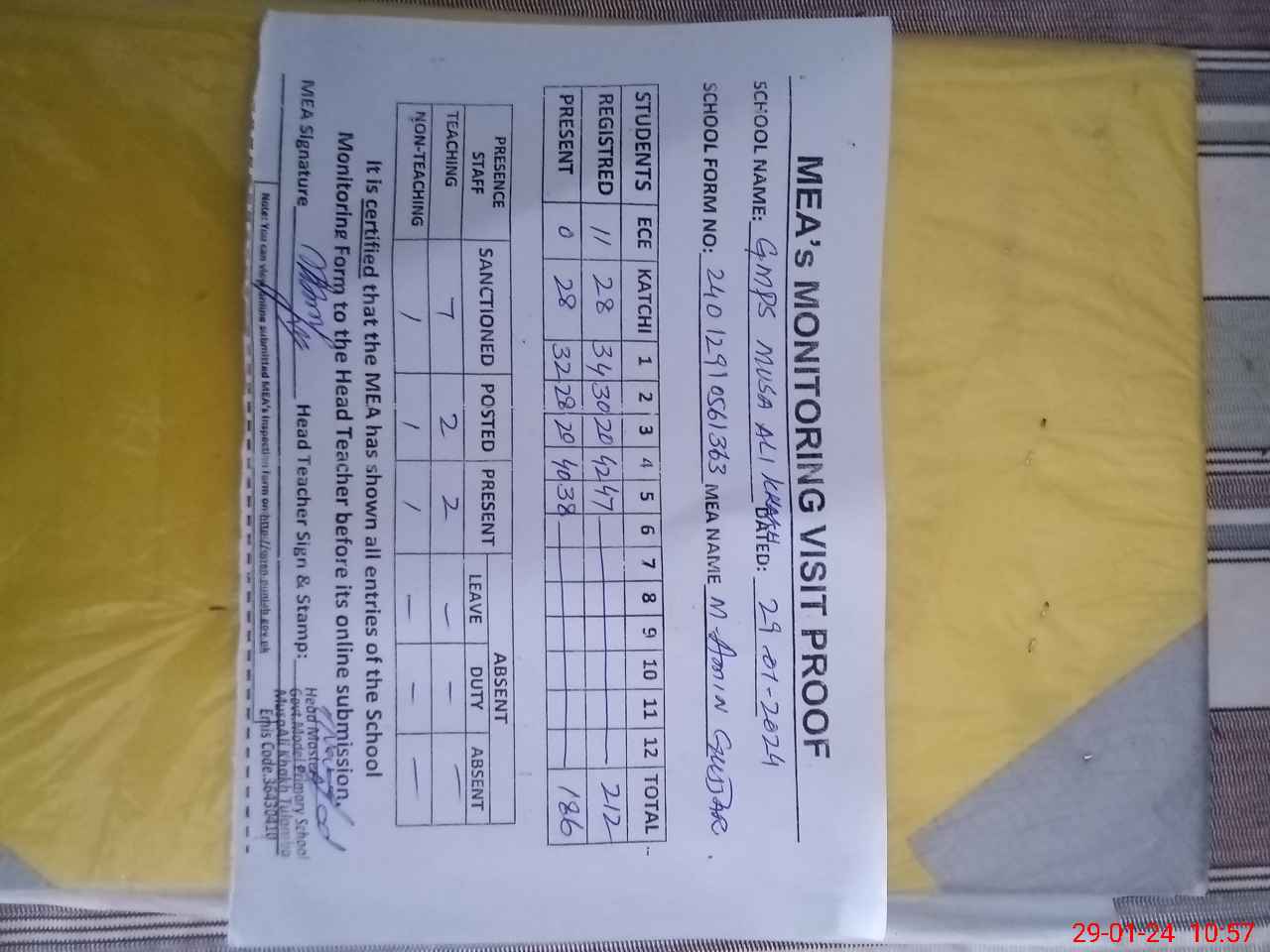 | Attendance Register | Head Teacher | MEA with School | Visit Proof |