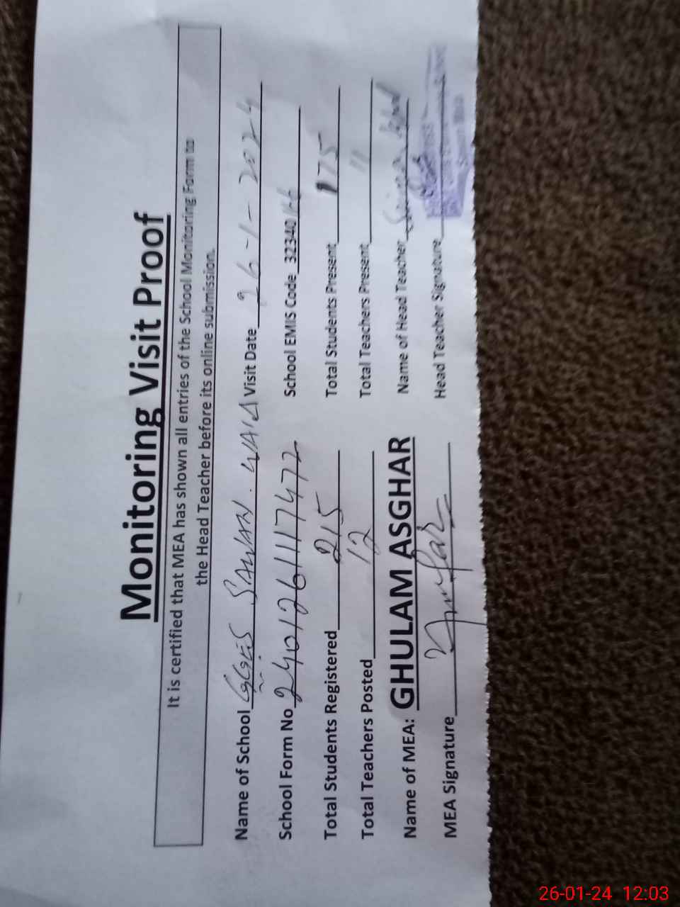 | Attendance Register | Head Teacher | MEA with School | Visit Proof |