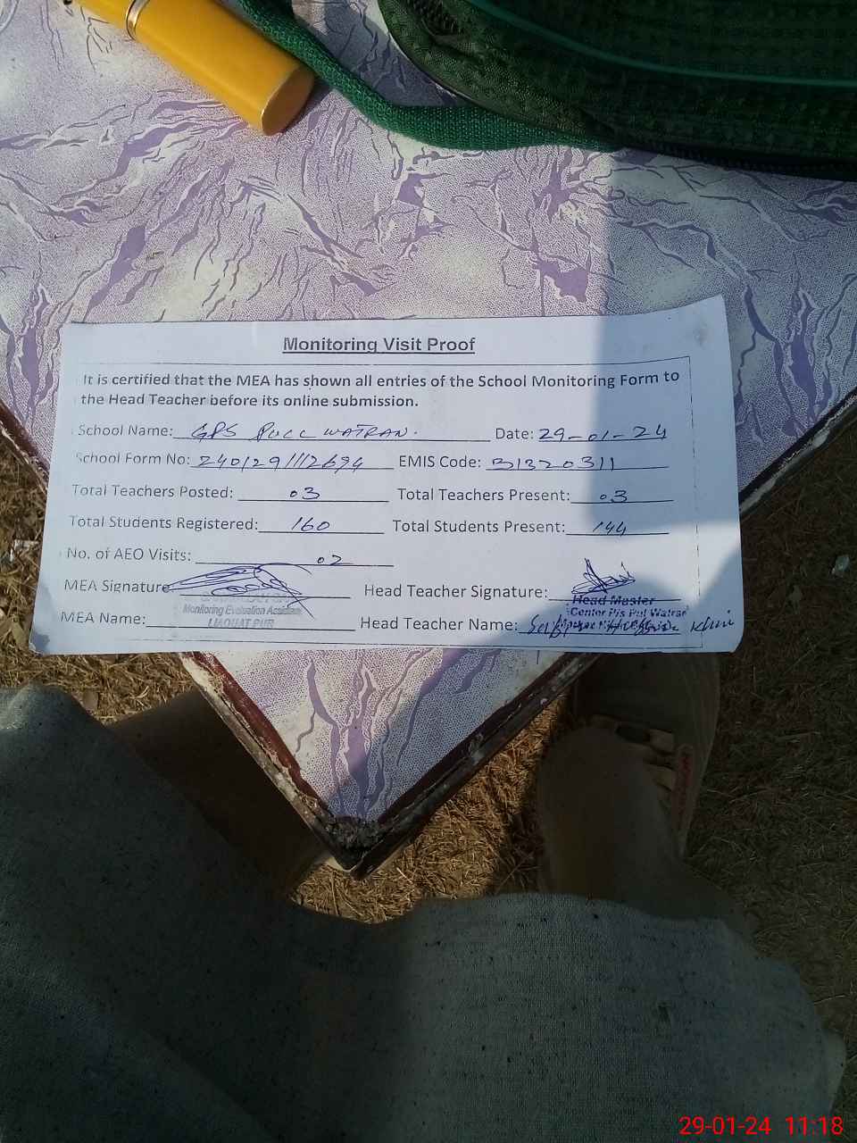 | Attendance Register | Head Teacher | MEA with School | Visit Proof |