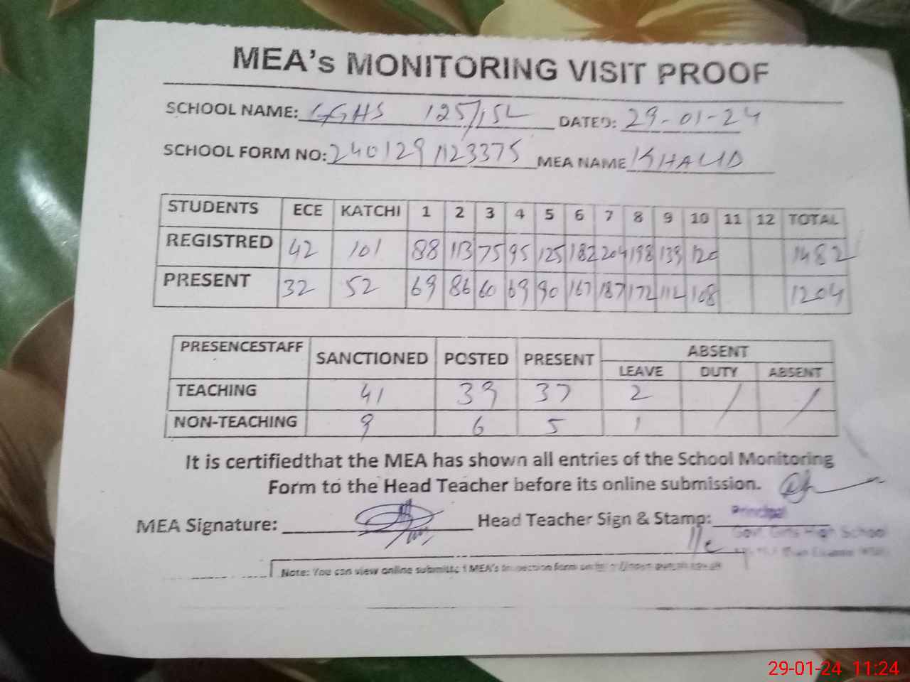 | Attendance Register | Head Teacher | MEA with School | Visit Proof |