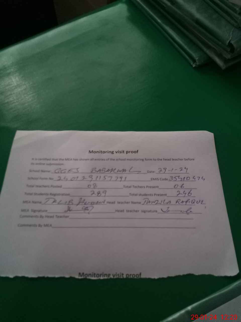 | Attendance Register | Head Teacher | MEA with School | Visit Proof |