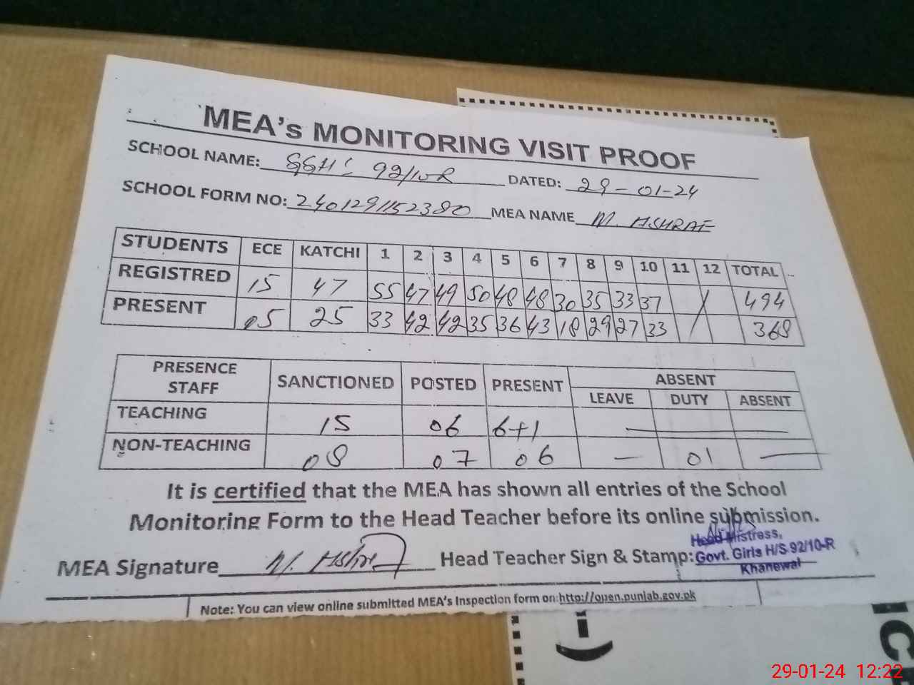 | Attendance Register | Head Teacher | MEA with School | Visit Proof |