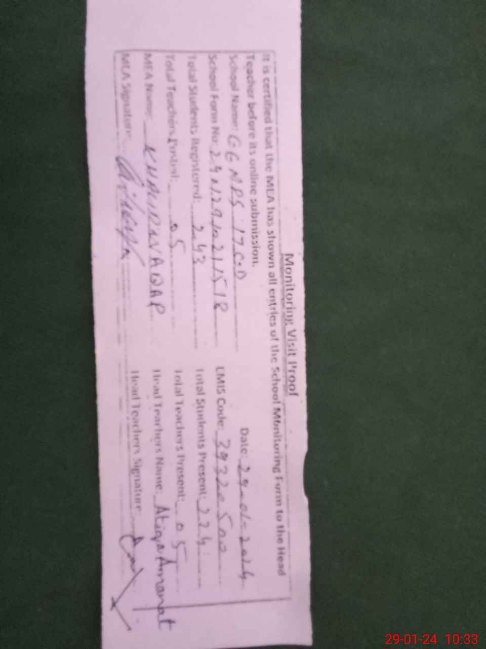 | Attendance Register | Head Teacher | MEA with School | Visit Proof |