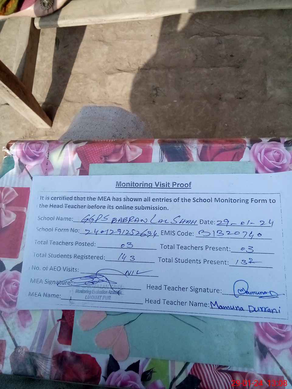 | Attendance Register | Head Teacher | MEA with School | Visit Proof |