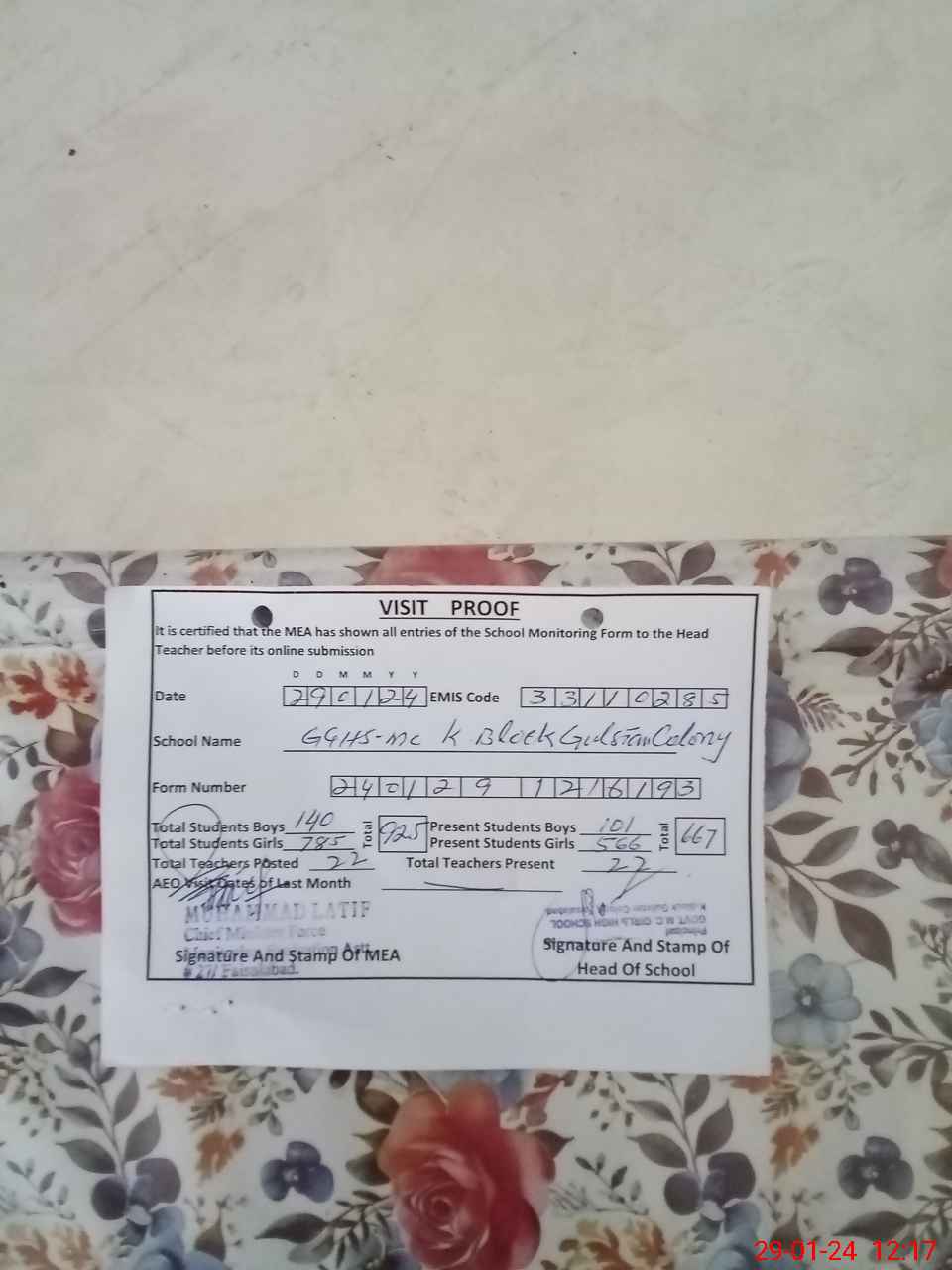 | Attendance Register | Head Teacher | MEA with School | Visit Proof |