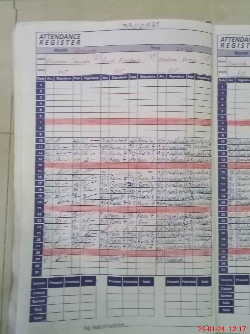 | CNIC | Full Name | Designation | R/C | Absence During Last Calender Month |
