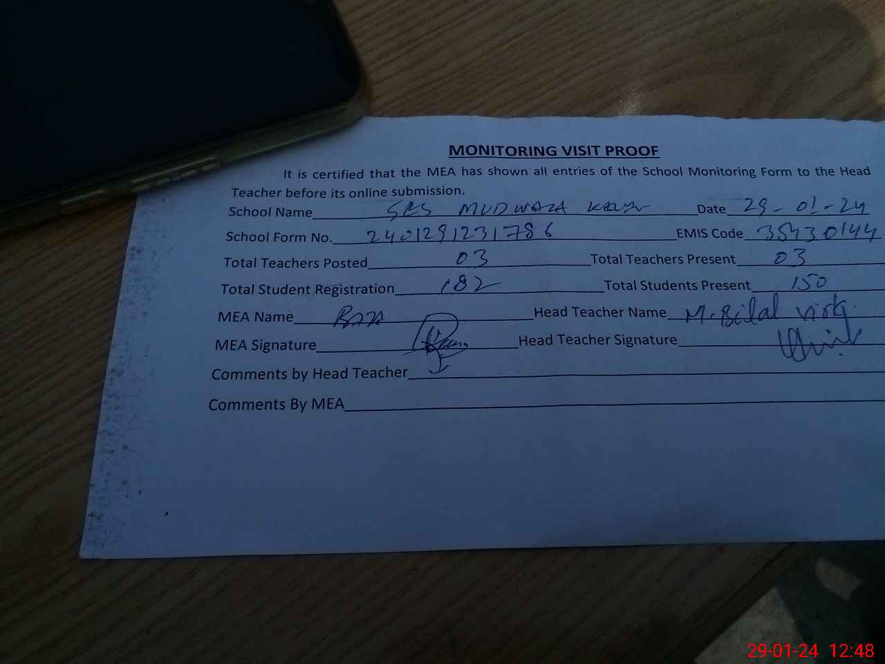 | Attendance Register | Head Teacher | MEA with School | Visit Proof |