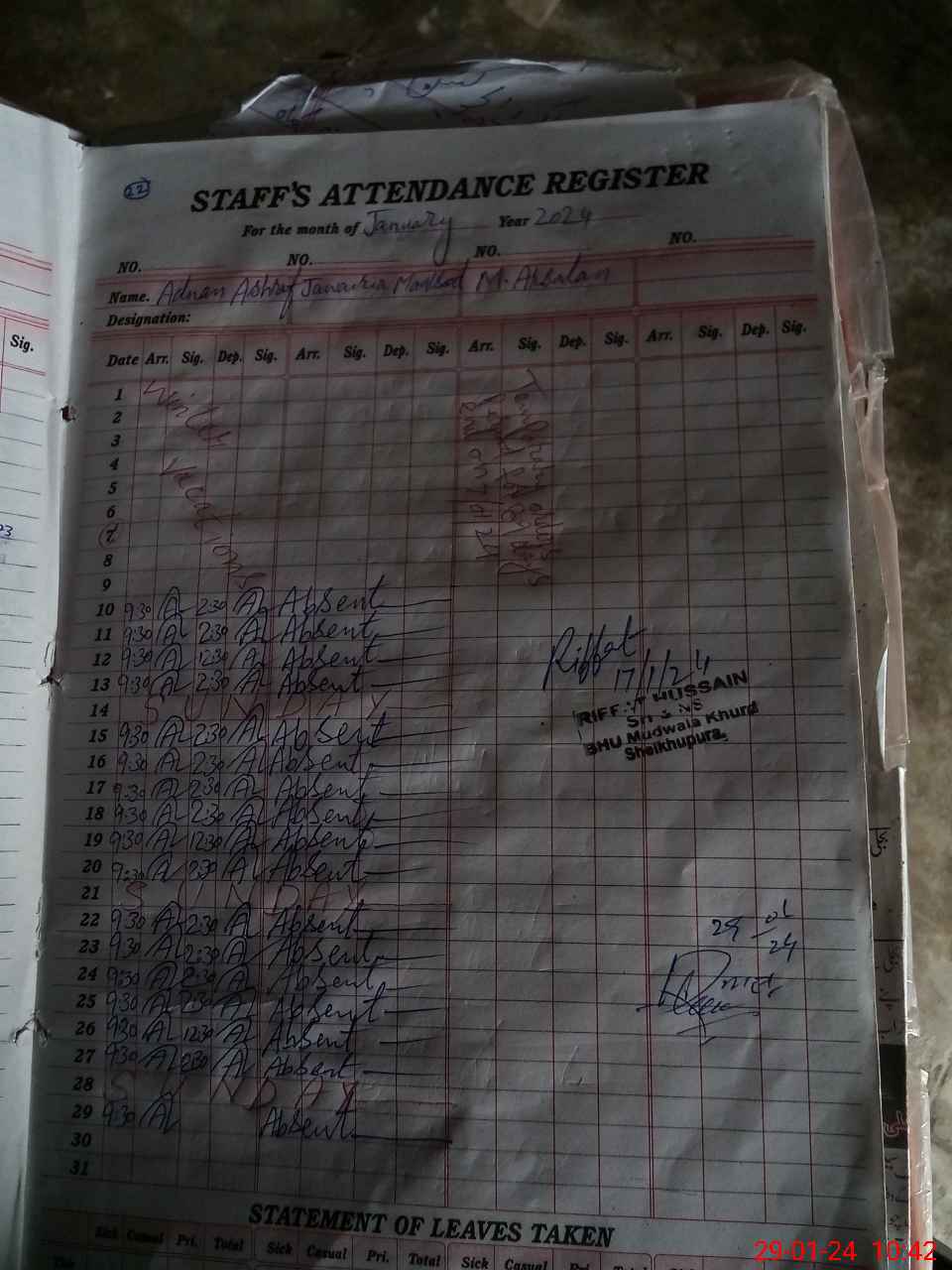 | CNIC | Full Name | Designation | R/C | Absence During Last Calender Month |