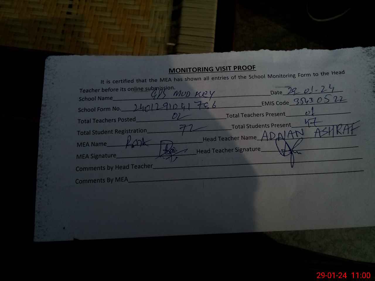 | Attendance Register | Head Teacher | MEA with School | Visit Proof |