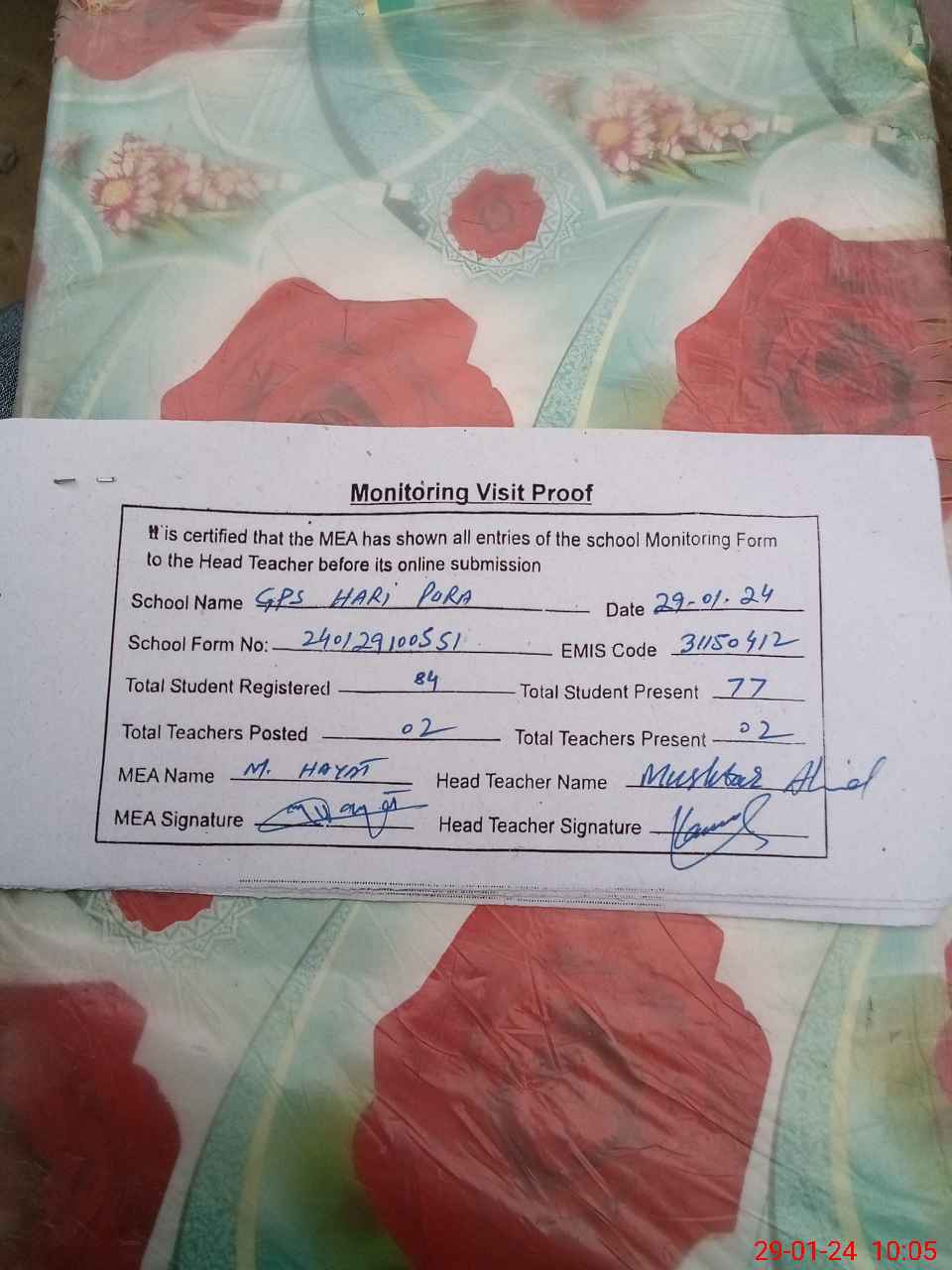 | Attendance Register | Head Teacher | MEA with School | Visit Proof |