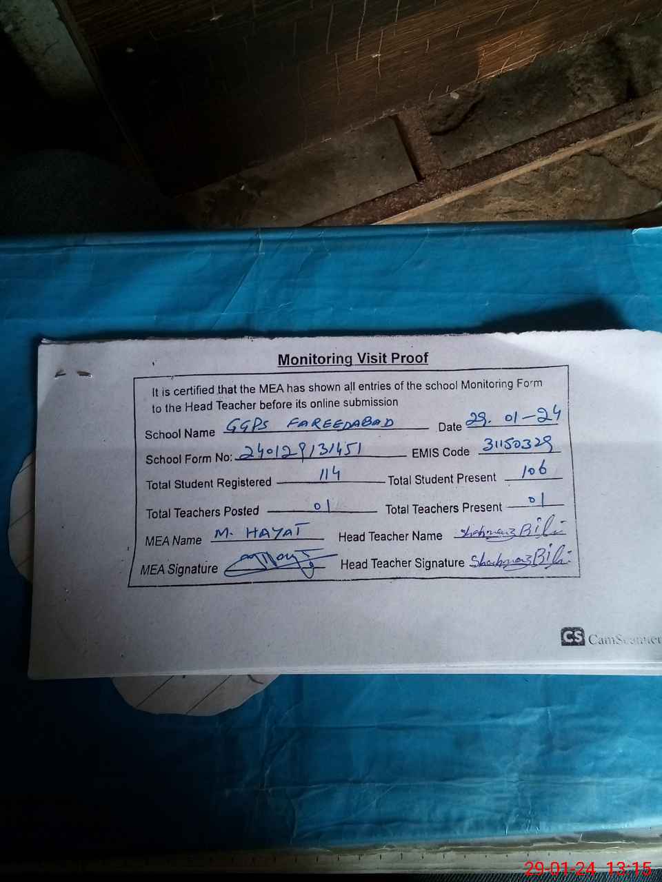 | Attendance Register | Head Teacher | MEA with School | Visit Proof |