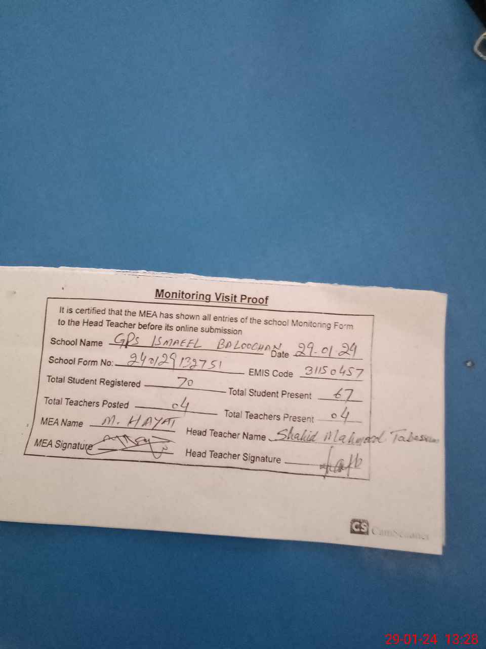 | Attendance Register | Head Teacher | MEA with School | Visit Proof |