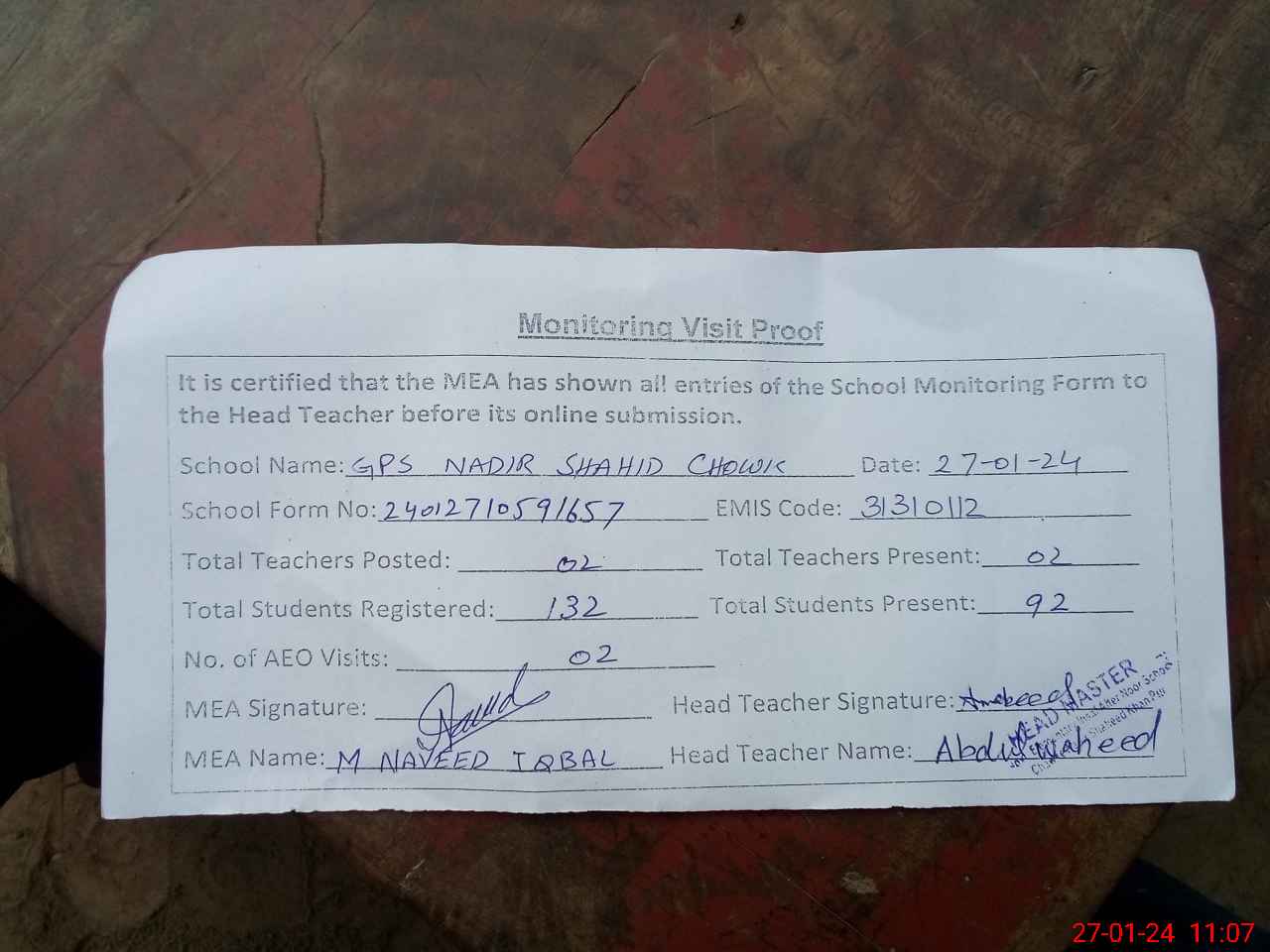 | EMIS Code: 31310112 | Name of School: GPS CHOWK NADIR SHAHEED (After Noon) | |||