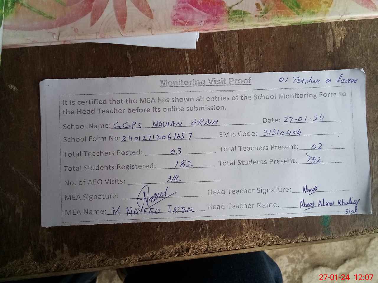 | Attendance Register | Head Teacher | MEA with School | Visit Proof |