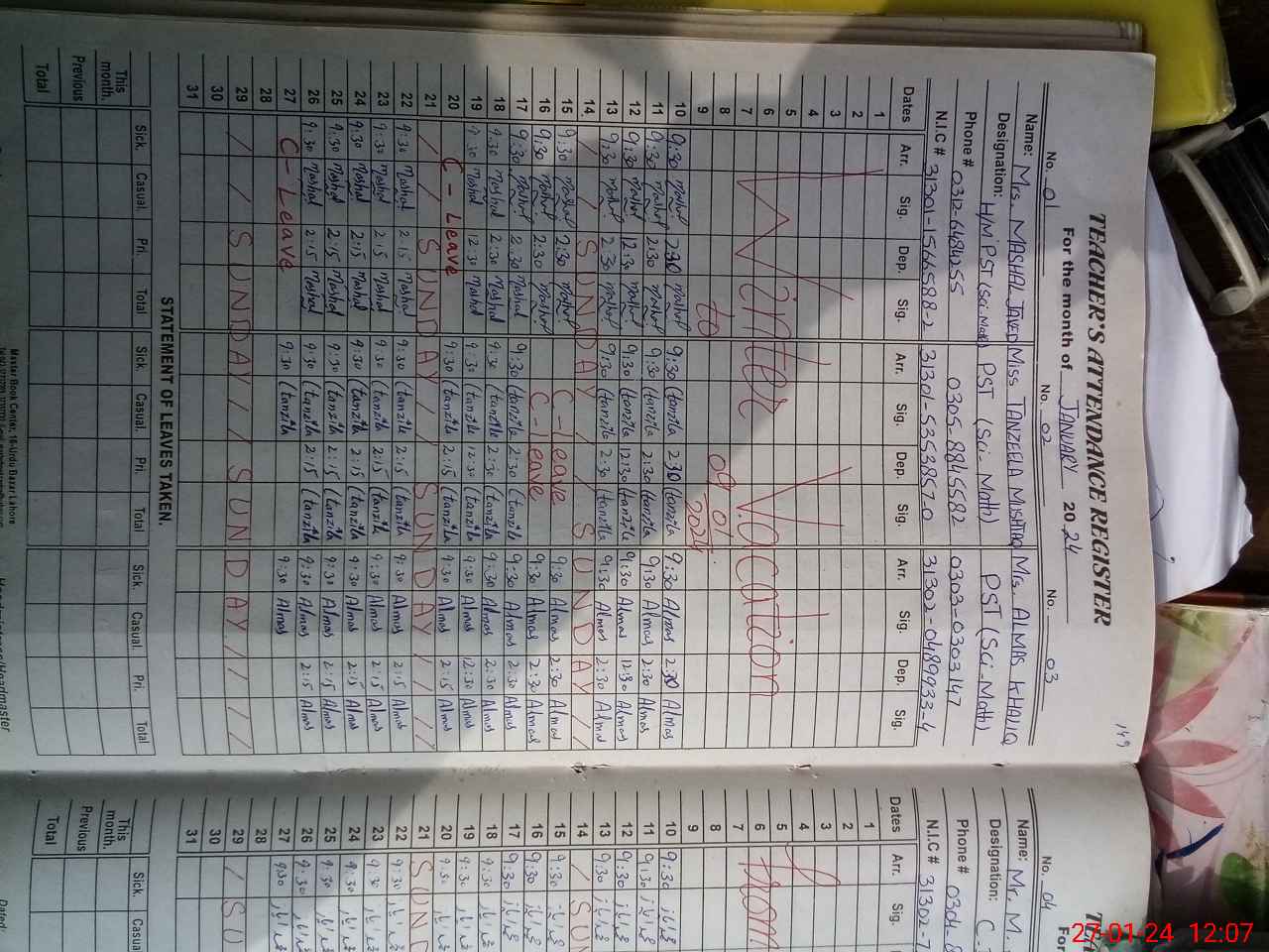 | CNIC | Full Name | Designation | R/C | Absence During Last Calender Month |