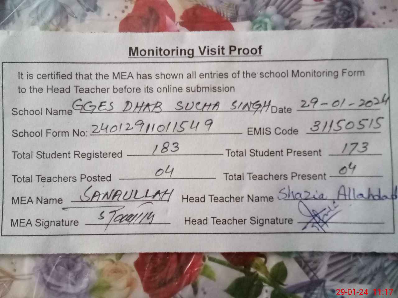 | Attendance Register | Head Teacher | MEA with School | Visit Proof |