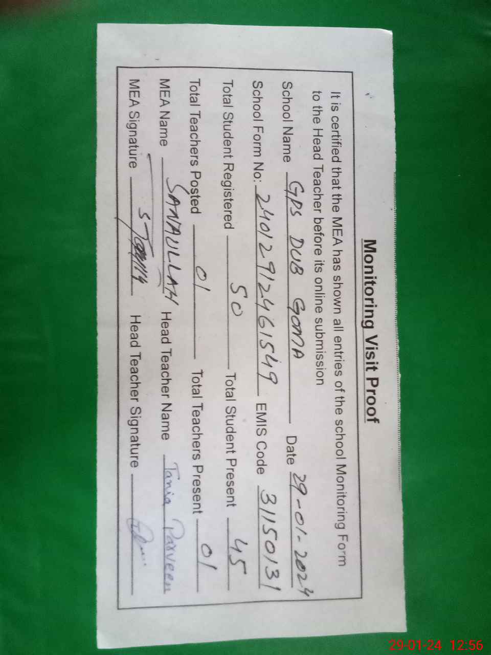 | Attendance Register | Head Teacher | MEA with School | Visit Proof |