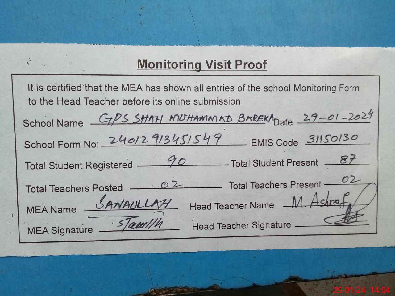 | Attendance Register | Head Teacher | MEA with School | Visit Proof |
