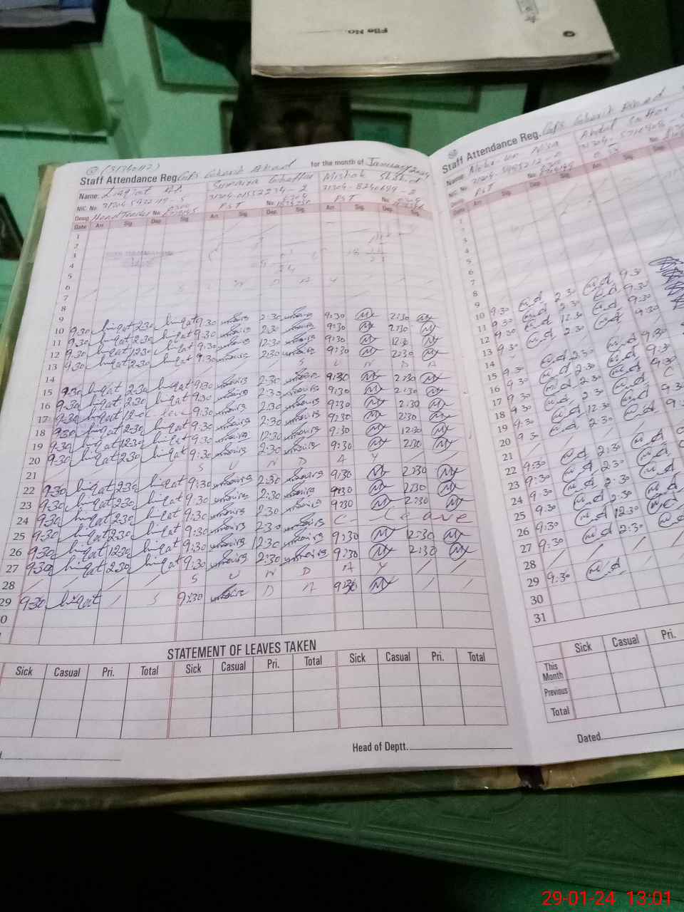 | CNIC | Full Name | Designation | R/C | Absence During Last Calender Month |