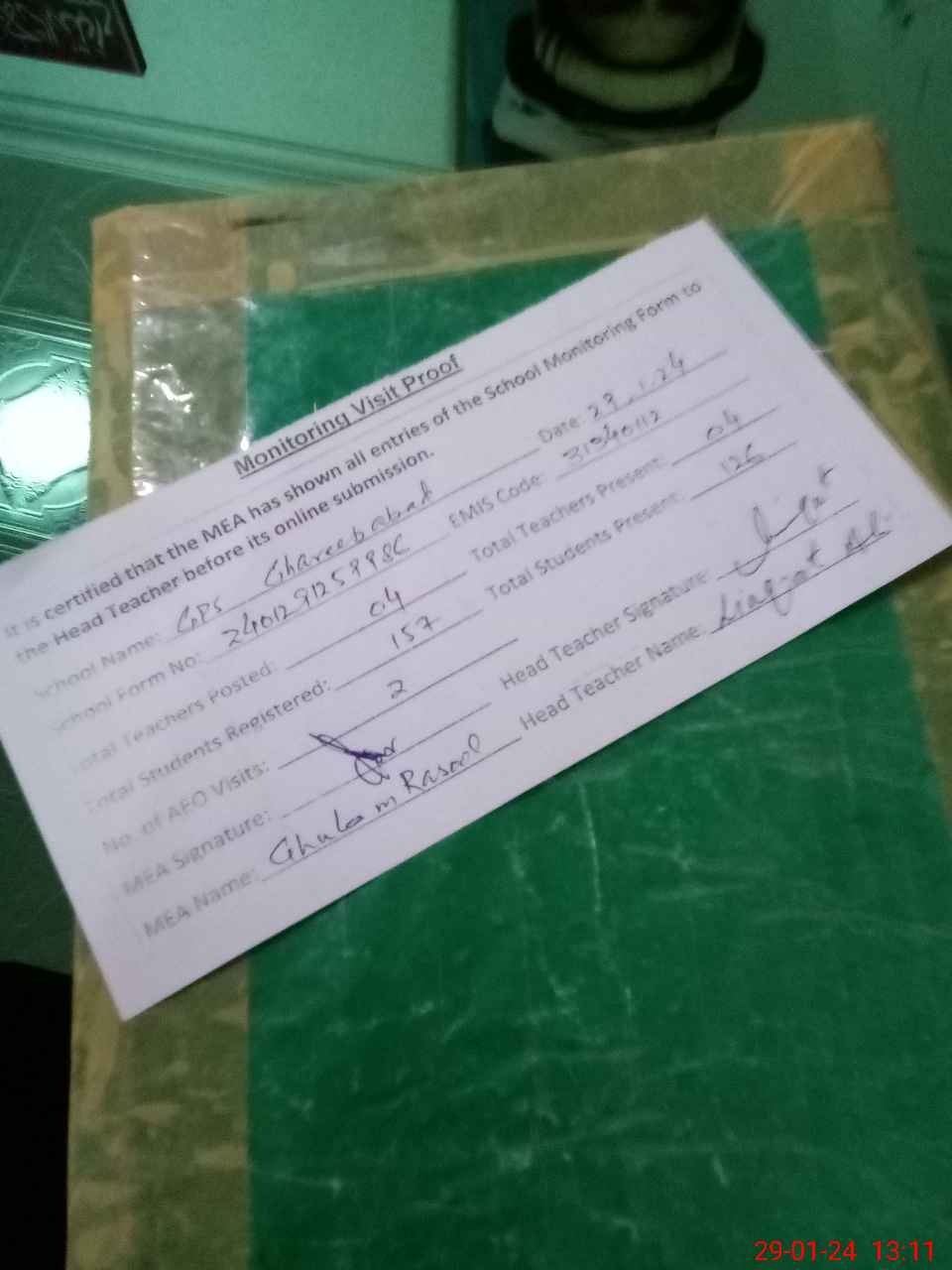 | Attendance Register | Head Teacher | MEA with School | Visit Proof |