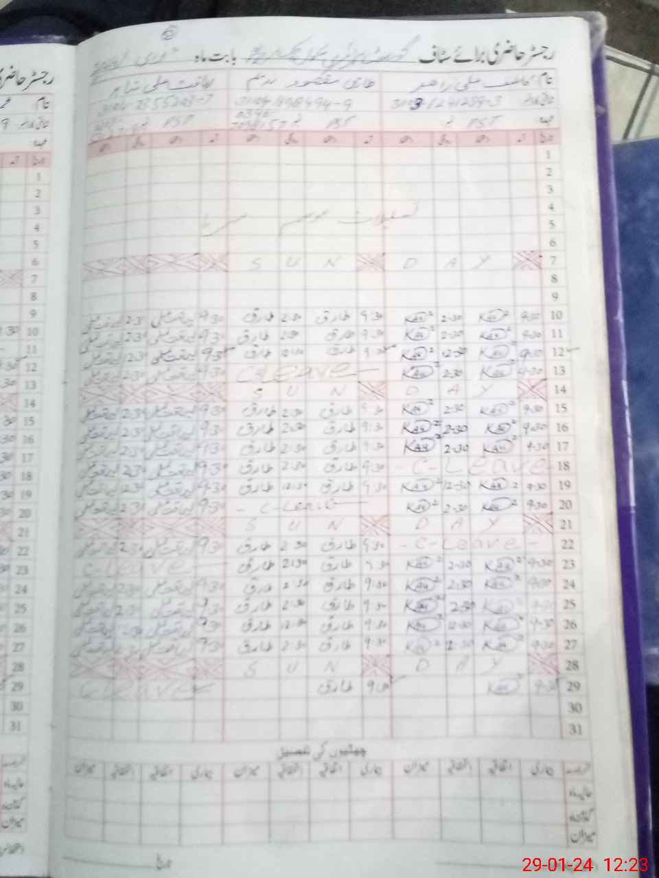 | CNIC | Full Name | Designation | R/C | Absence During Last Calender Month |
