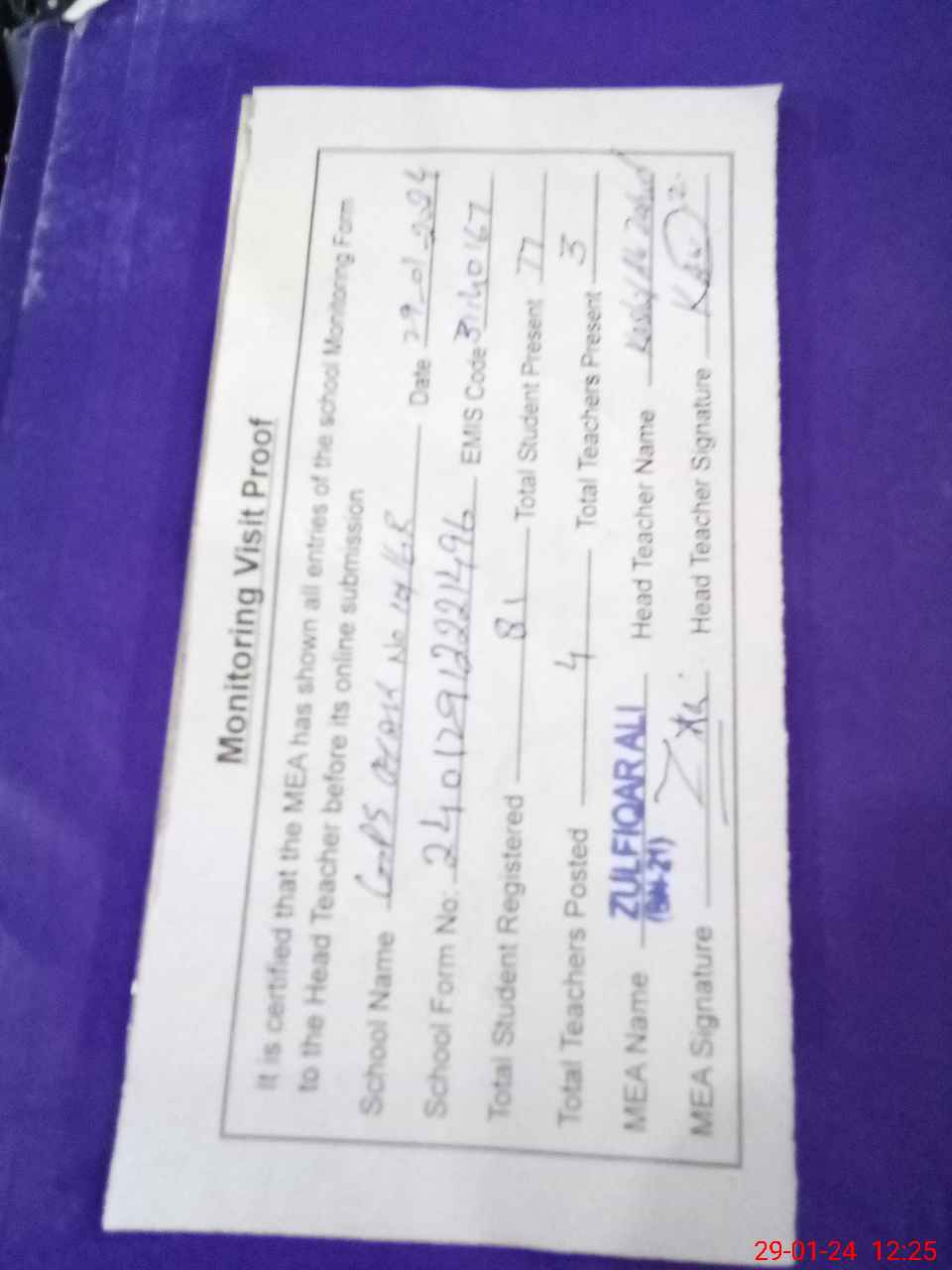 | Attendance Register | Head Teacher | MEA with School | Visit Proof |