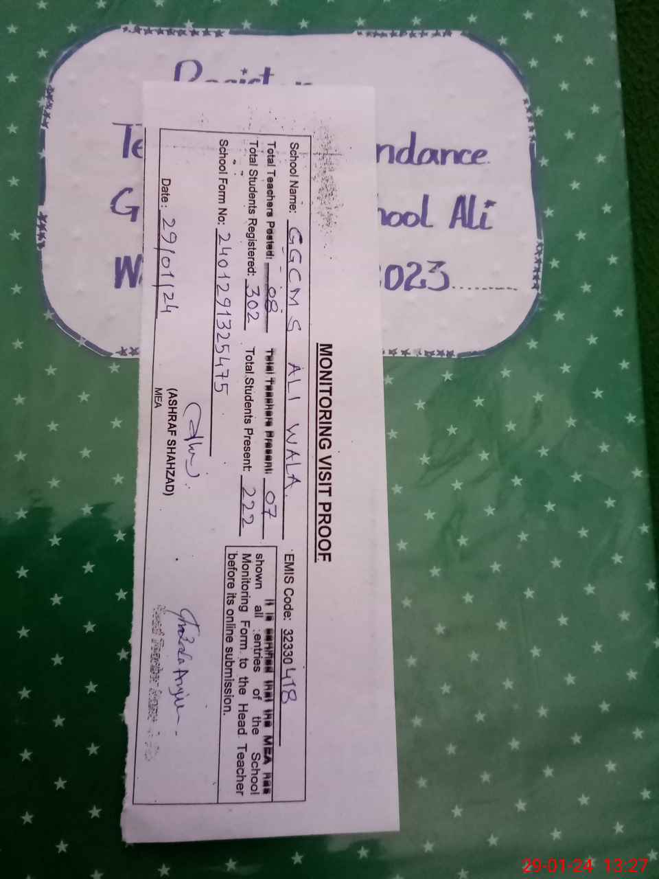 | Attendance Register | Head Teacher | MEA with School | Visit Proof |