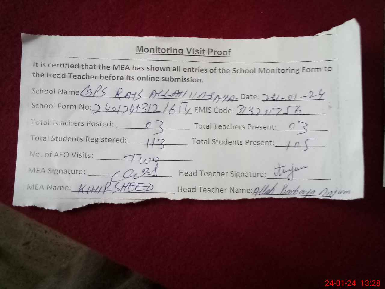 | Attendance Register | Head Teacher | MEA with School | Visit Proof |