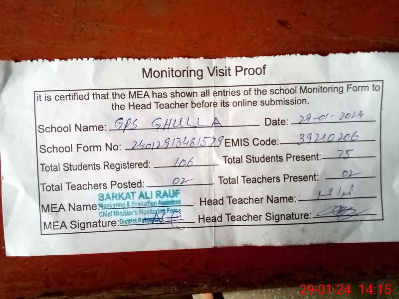 | EMIS Code: 39210206 | Name of School: GPS GHULLA P/O PAKPATTAN | |||