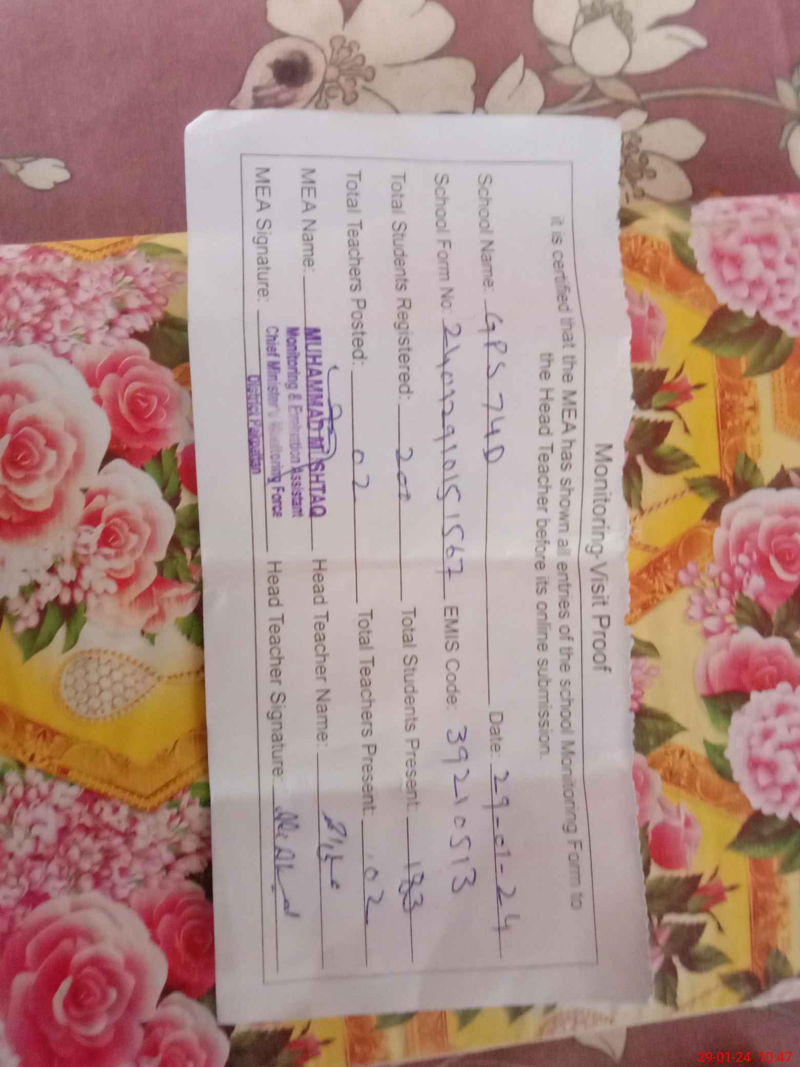 | EMIS Code: 39210513 | Name of School: GPS CHAK NO.74 D KHARLAN WALA | |||