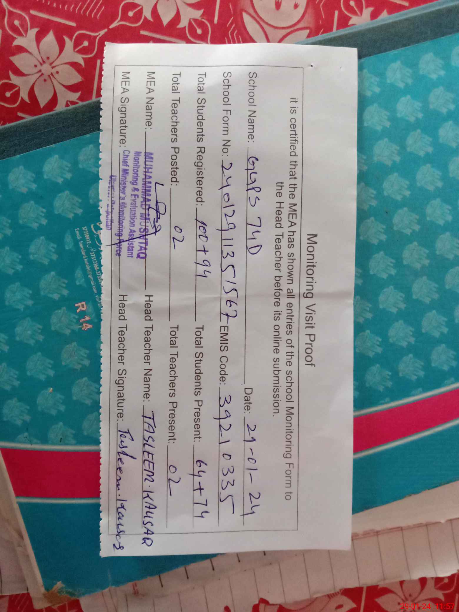 | Attendance Register | Head Teacher | MEA with School | Visit Proof |