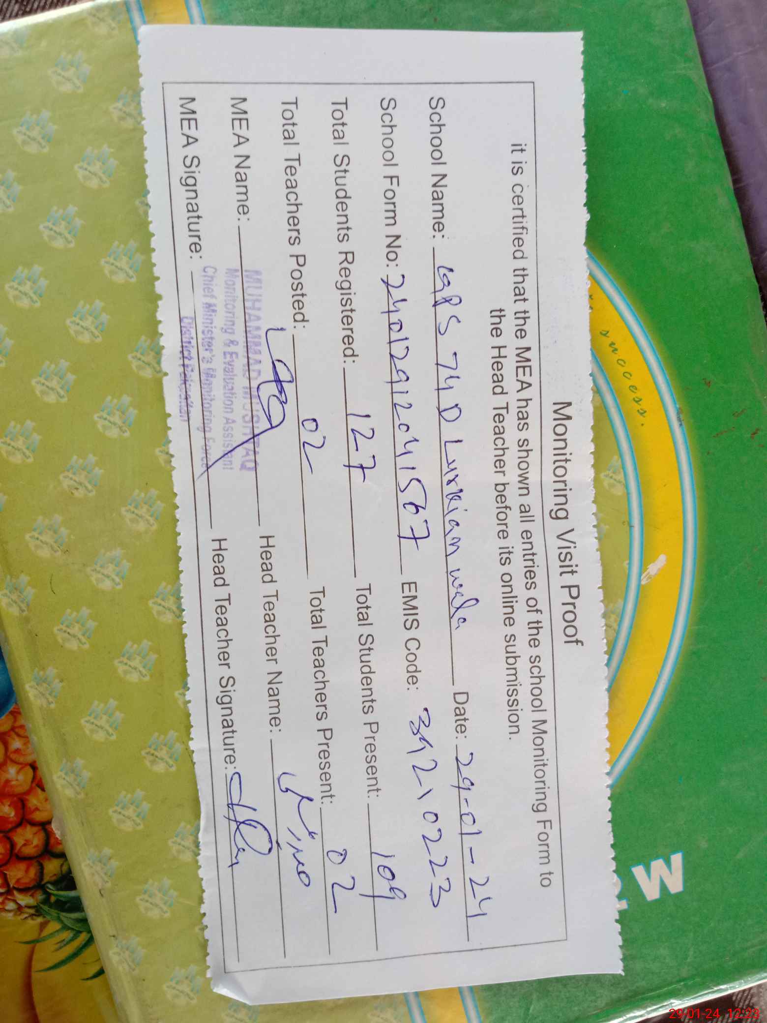 | Attendance Register | Head Teacher | MEA with School | Visit Proof |