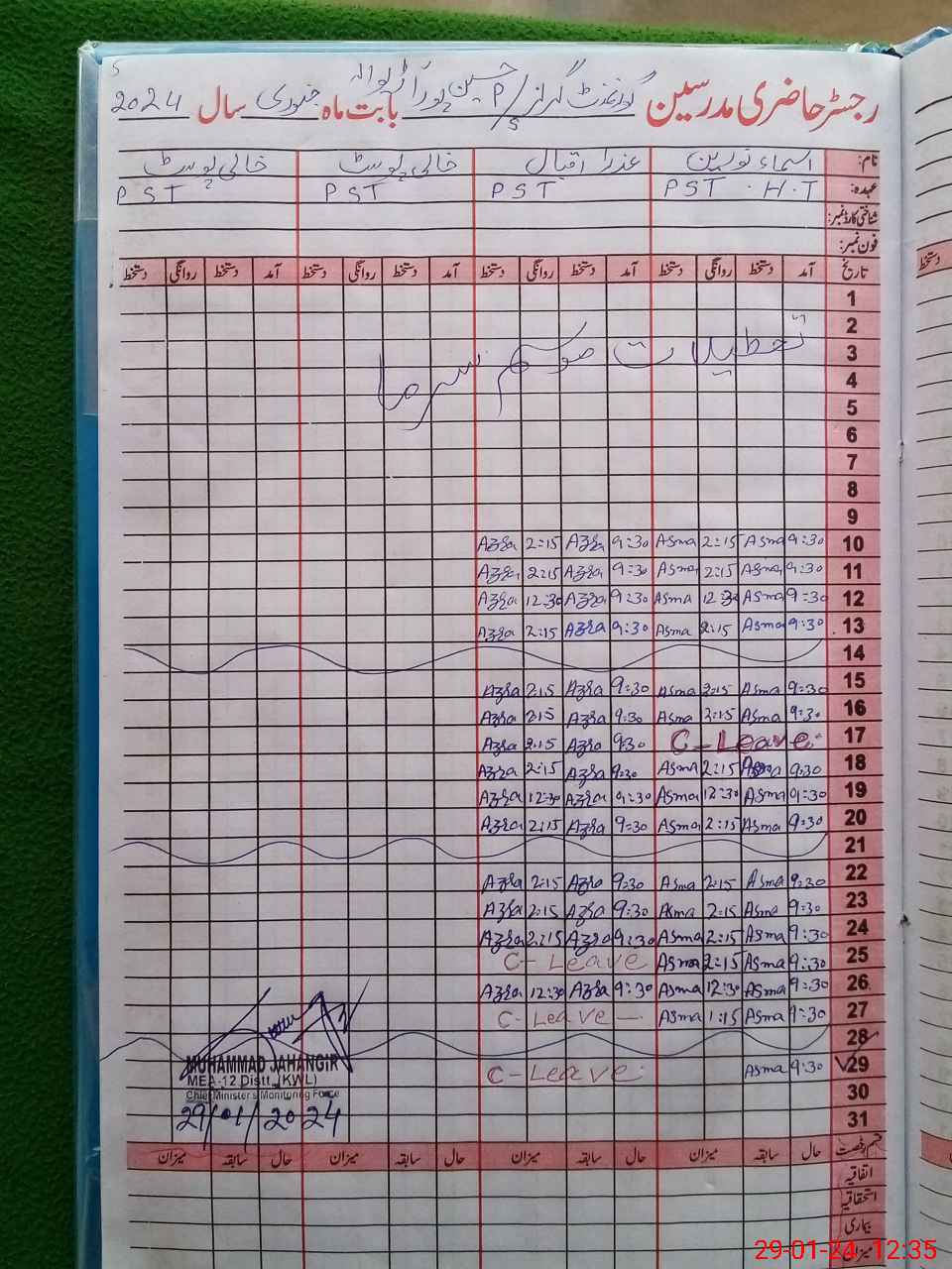 | CNIC | Full Name | Designation | R/C | Absence During Last Calender Month |