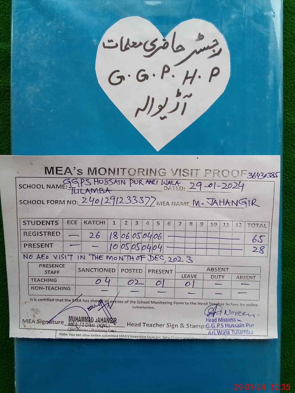 | Attendance Register | Head Teacher | MEA with School | Visit Proof |